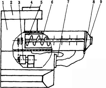 图1-11-19 挤出机结构示意图 1-机架 2-控制箱 3-传动系统 4-料斗 5-挤压室 6-螺杆 7-进出水管 8-加热器 9-出料口 挤出机工作原理:经搅拌好的糖料稍经冷却,即投入挤出机。由于挤出机螺杆6不等距,它的前端设有一个扁平的出料口9,当糖料由转动的螺杆强行从出料口挤出时,即可成为组织紧密、表面光洁的带状糖坯。其中挤压室5为挤压机中主要工作部件,它主要有挤压腔体、挤出螺杆等构件。挤压腔体为夹套式,内接冷暖水回路。螺杆主要起挤出作用,有的则起着挤出与捏合作用。常用的螺杆为双螺杆式的。螺杆分推进、捏合、挤出三个不同区域。根据不同物料的需求,可选择不同组合的螺杆。 延压与切块系统主要是将从挤出机出来的糖坯连续不断地经压延辊组12辊压成规定的厚度。在糖坯由厚到薄的压延过程中,为使不发生粘辊等现象,在糖坯的正反面均匀地涂上一些干燥粉,这一工作由撒粉器13完成。为节约用料、净化环境、提高糖片质量,在整机中装有粉尘回收装置5。将涂于糖片表面多余的粉末通过吸管被吸到粉尘回收装置中的过滤器中,经过过滤后可重新回收利用。糖片经过四道辊压成标准厚度后,被送至纵、横切刀处进行切割,再送入老化室进行12~24h的老化处理,最后进行包装。 |