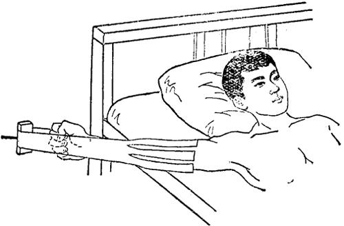 图8~3 悬吊皮牵引方法 【牵引重量及时间】 重量以能使小儿臀部恰好离开床面为度。时间两周左右,不宜超过三周。 【注意事项】 (一)牵引过程中,应使患儿保持仰卧位,以免患儿翻身时使骨折扭转移位。 (二)注意观察足部血运,调整绷带的松紧度,以免发生肢体坏死。 三、上肢胶布皮肤牵引: 【适应症】 肩胛骨关节盂或肩胛颈骨折,远端骨块向内下移位,快速手法复位失败者;肱骨外科颈骨折或肱骨干上1/3骨折,肿胀严重,移位明显,不宜快速复位者。 【器材准备】 长宽胶布1条(宽为肢体周径1/4,长为伤肢骨折部位以下的两倍再加15厘米),尾档板1个、牵引绳1条,床边牵引架(图8~4)1个、上肢妥马斯氏架(图8~5)1个,胶布、绷带、纱布方、安息香酸酊等。