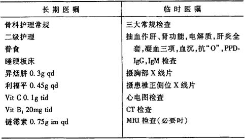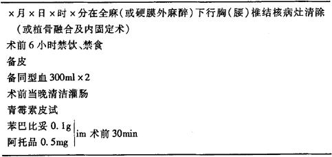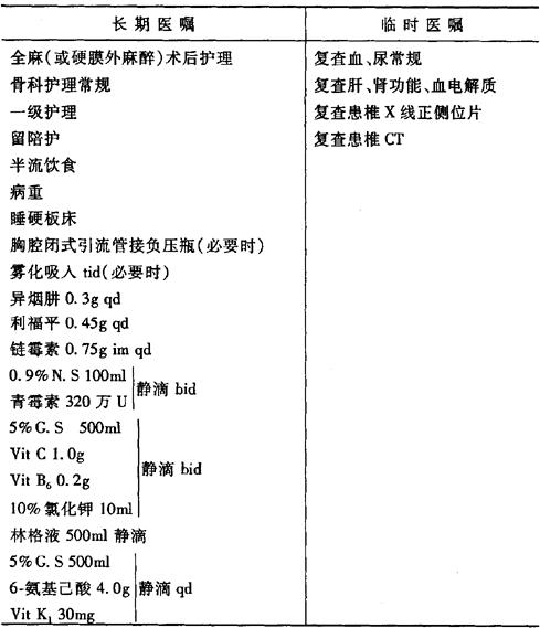 说明:(1)术前准备参考髋关节结核,如为腰椎结核,术前须作肠道准备。 (2)术后保持电解质平衡;继续抗结核1~2年。 (3)胸椎手术留置之闭式引流管,待术后48小时摄胸部X线片复查见肺膨胀良好,无明显胸腔积液时拔除。 (4)术后石膏背心或支架保护,出院后定期复查X线片。 |