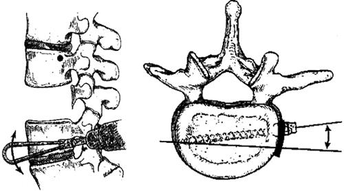 图13-53 A.切除小关节突及椎弓根内侧半,绕过硬膜囊将椎管前方的骨折片压平;B.椎管前壁平整,压迫解除 (4)将棒安放到螺钉上,拧紧连接的螺母。用撑开器将伤椎上下椎体的椎弓根螺钉撑开,恢复椎体的高度。撑开以后,将椎弓根螺钉尾部压缩,以使椎体前缘张开,矫正其骨折的后凸成角畸形,恢复生理弧度(图13-54)。最后在两侧棒之间用1~2个横向连接器连接起来,向中间靠拢,产生强硬的力量,以加强其内固定的强度。