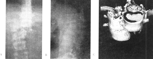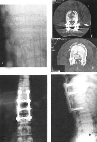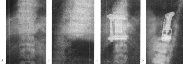 图13-40 25岁男性,被搅拌机搅伤,术前X光片和CT(A、B、C)可见L1骨折脱位,层叠于T12上手术采用右侧前方入路。L1椎体切除后获得复位,大块髂骨植骨和Z-plate Ⅱ内固定