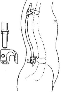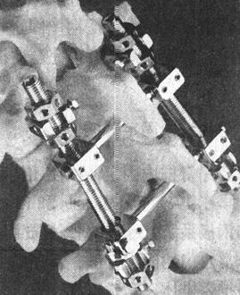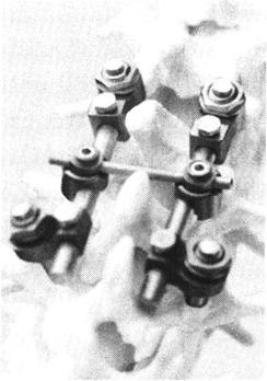 图13-43 Harrington撑开装置示意图 如果器械固定部位是在下腰椎,主张使用按照腰椎的前突预弯成形的方形头Harrington棒,并且使用改良的方头钩。这可以保持正常的腰椎前凸和增加稳定性。在胸椎和胸腰椎结合部位,传统的圆形头Harrington棒和方形头棒均可以使用。术后处理:患者术后开始卧床休养,拆线后石膏或支具固定12周。支具固定后开始下床活动,鼓励早期活动和康复锻炼。 Harringtion压缩固定器械可以用于胸腰椎骨折,特别是在有后柱因张力而破坏的情况下。有小号(3.18mm)和大号(4.76mm)两种带螺纹的压缩棒可以为骨折愈合和后外侧柱融合提供坚强的固定。它们在固定屈曲牵开型损伤和Chance骨折中最为有用。在用于胸椎时,Harrington压缩棒应该与安放在横突基底周围的钩结合使用。在腰椎,钩应该安放在椎板深部,以提供牢固的固定。研究已经证实,压缩棒不应该与椎板下钢丝合用,因为钢丝可能将椎板下钩拉至深面的神经结构,引起医源性的神经损伤。安放在横突上的钩要比安放在椎板下的钩所产生的力量小,但不易损伤神经结构。生物力学研究发现,在治疗屈曲与旋转相结合的损伤时压缩棒要比撑开棒的力量强。压缩棒在屈曲和侧弯时容易使横突骨折而导致手术失败,也容易在伸展时因脱钩而失败。 Harrington器械提供了长节段的牢固固定,但牺牲了胸腰椎矢状面上的曲线,也不能在胸腰椎交界处提供前凸。由于Harringtion器械不能很好地控制上钩的屈曲和旋转,使钩-椎板界面的应力集中在椎板边缘,所以脱钩很常见。过度的椎板切除和撑开可以造成椎板骨折。如果留在钩外的棒长度小于1cm,钩就很容易从棒上脱出。虽然有如此多的并发症,但Harrington器械仍然能为患者的脊柱提供足够的稳定性,在它的基础上发展出了许多新型的脊柱后路内固定器械。 (二)Luque器械 1976年,在墨西哥城的一个着名内科医生Eduardo Luque在Harrington器械的启发下,发明了新的的棒系统。Iuque棒是预弯的圆型棒,直径有4.76mm和6.35mm两种,通过多节段椎板下钢丝固定在脊柱上。Luque棒使用多节段的固定,比传统的Harrington固定器械能提供更牢固的内固定和抗旋转力量。这种器械曾被用于矫正脊柱侧弯畸形,也用于胸腰椎骨折和脱位的固定。McAfee已经证明Harrington棒的抗扭转性能较差,而可以承受最大能量的系统是Luque节段系统。生物力学测试发现Luque节段性脊柱固定器械的失效是由于固定节段以上或以下的骨折-脱位引起。正如生物力学所证明的那样,Luque系统的薄弱点是不能抵消纵向负荷,所以它不能为不稳定的爆裂性骨折提供牢固的固定。此系统似乎最适合于治疗伴有完全神经损伤的胸椎或腰椎的平移损伤。当用于神经功能正常或有不完全神经损伤的患者时,穿椎板下钢丝时一定要小心,避免损伤神经。椎板下钢丝的神经系统并发症发生率比较高,约10%患者有感觉障碍,还会影响脊髓血供出现术后瘫痪。对于术后瘫痪的患者要立刻手术,拆除内固定。 手术方法:患者俯卧,显露脊柱需要做固定的节段。对胸腰椎的骨折-脱位,我们主张使用牢固的Luque长方形结构或者使用双棒固定。范围为上方3个节段、下方3个节段。用咬骨钳去除覆盖在需要固定的每个节段的椎板间隙中的软组织以显露黄韧带。腰椎段因为有脊往前凸,所以在椎板间隙处椎板经常呈叠瓦状。用咬骨钳去除这些骨组织。用咬骨钳咬开黄韧带,用小的椎板咬骨钳将其去掉。需要用器械固定的间隙中的黄韧带都要去除。将1.0mm的钢丝做成襻,将襻弯成两个直角,将钢丝襻从每个椎板下穿过,两个弯处的距离应该与准备固定的椎板的宽度相等。从头侧向尾侧方向穿过钢丝(图13-44)。将中间节段的钢丝襻分开,这样每个椎板下有两根钢丝,将其牵向伤口的两侧。在穿钢丝时小心不要用力使钢丝挤压硬膜。切除两侧的关节,椎板去皮质后在关节周围植骨。插入Luque棒,小心使每个棒的短臂或横臂压在长臂或纵臂下以预防旋转和植入物旋转后的移位。小心将钢丝围绕棒拧紧,使脊柱与棒固定在一起(图13-45)。常从棒的中间开始拧紧钢丝,然后依次向两侧拧紧其他钢丝。爆裂性骨折可以通过Harrington棒固定以防止塌陷。常规做侧后方关节融合,插入负压引流管后,逐层缝合伤口。