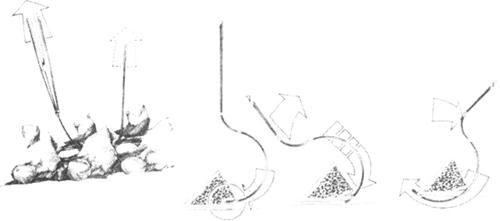 图13-52 椎弓根螺钉进针点和方向,左Roy-Camill法,右Weinstein法 定好进针点后,凿开外层皮质,用手锥钻孔,方向平行椎体终板与椎体后缘垂直,倾斜中线倾斜5°~15°,角度根据不同的椎体而调整。用力宜轻柔,顺椎弓根钻入,不能使用暴力。当钻入30~40mm时,取出手锥,用探针检查孔道四壁和底部。感觉四壁和底部均为骨质,提示定点和定向正确,孔道位于椎弓根和椎体内。当钻好所有的孔后,在孔内插入克氏针,使用C臂X线机透视,确认方向和深度正确,必要时作出调整。用丝锥攻丝,拧入长度合适的椎弓根螺钉,再次透视以确定螺钉位置。 (3)如需减压,此时可以切除伤椎椎板及上位脊椎部分椎板和下关节突。将伤椎的一侧椎弓根切除或两侧椎弓根内侧半切除,进入椎管。认清经椎弓根下缘向下外方行走的神经根,显露出硬脊膜囊的外侧面,操作中尽可能不牵动或压迫硬膜囊。用弯头的神经剥离器探查硬脊膜前方,若有松动的骨折片及破碎的椎间盘组织,均应在直视下钳夹取出。若椎体壁向后膨隆凸入椎管致硬脊膜前方受压,则可用弯头的硬刮匙经椎弓根切除后的缺口进入椎体,刮去椎体后部的松质骨,使椎体后壁成为薄层骨壳,再用小型骨膜剥离器把椎体后壁向前压入椎体(图13-53)。椎体骨质掺血可用骨蜡填塞,椎管内静脉丛出血可用明胶海绵止血。