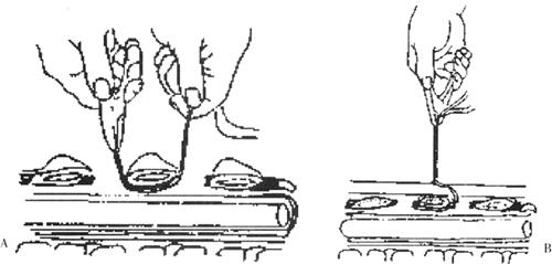 图13-54 A.使用撑开器进行撑开,恢复椎体高度;B.压缩螺钉尾部,使椎体前缘张开 (5)将横突去皮质,取自体髂骨作横突间植骨。放负压引流,逐层关闭切口。 对胸腰段骨折,用椎弓根钉内固定伤椎的上两节和下一节。对L2以下的椎体骨折,只固定上一节和下一节。术后用塑料支具固定12周,早期开始功能锻炼。