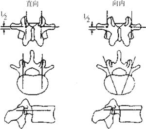 图13-51 Sofamor的TSRH-3D系统 手术方法: (1)患者全麻,置于过伸的俯卧位,以骨折椎为中心作后侧正中切口,长约15cm。切开皮肤、皮下组织,显露腰背筋膜。紧贴棘突两侧切开腰背筋膜及棘突骨膜,行椎板骨膜下剥离,向两侧剥离骶棘肌至小关节外侧缘和横突,显露伤椎及上下各一个脊椎节段,用自动牵开器牵开。 (2)椎弓根定点标志及定向有2种方法:Roy-Camille法:平分两侧横突的水平线与连接上下关节突中央的垂直线交点下1mm处垂直进入;Weinstein法:采用椎体的上关节突外缘垂直延长线与横突中轴水平线的交点,即预计植入椎的上关节突的颈背部,该处椎板外缘有一典型的骨嵴,定点标志也相当于紧靠骨嵴外上方的凹陷处。Weinstein法的椎弓根定点标志相当于椎弓根轴线在椎弓后方的投影点,因而此法更为常用(图13-52)。