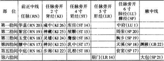 | 释义 | 胸部 定位方法:仰卧体位。先在前正中线上,天突下1寸处取璇玑(RN 21);再在肩胛骨喙突上方,锁骨下窝凹陷处,距前正中线6寸处取云门(肺经LU 2);然后将璇玑至云门划作3等分,其外1/3,锁骨中点下缘处取气户(胃经ST 13);气户和璇玑之间,锁骨下缘取俞府(肾经KI 27)。从璇玑直下为任脉经线,从俞府直下(任脉旁开2寸)为肾经线,从气户直下,下对乳中(任脉旁4寸)为胃经线。详见表3-54。 表3-54 胸部常用穴位关系表