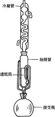 图4-2-2 索氏脂肪抽提器 3.操作方法 (1)样品的处理: 固体样品:精密称取2~5g(可取测水分后的样品),必要时拌以海砂,以使样品松散,全部移入滤纸筒内。 液体或半固体样品:称取5.0~10.0g,置于蒸发皿中,加入海砂约20g于沸水浴上蒸干后,再于95~105℃干燥,研细,全部移入滤纸筒内。蒸发皿及附有样品的玻璃棒,均用沾有乙醚的脱脂棉擦净,并将棉花放入滤纸筒内。滤纸筒上方用少量脱脂棉塞住。 (2)抽提:将滤纸筒放入抽提管内,连接已在103℃±2℃干燥箱内干燥至恒重的接受瓶(前后两次称量差不超过0.002g)。由抽提器冷凝管上端加入无水乙醚或石油醚至接受瓶体积的2/3处,于恒温水浴上加热,使乙醚或石油醚不断回流抽提;调节水浴温度至每小时回流8~12次,抽提6~12h。至由抽提管下口滴下的抽提剂滴在滤纸上,挥发后无痕迹。 (3)称量:取出滤纸筒继续水浴加热,用抽提管回收乙醚,当抽提剂液面近虹吸时立即取下抽提管,将其下口放到盛试剂的瓶口,使之倾斜,使液面超过虹吸管,让抽提剂流入瓶内。如此,将抽提剂全部回收,取下接受瓶,于水浴上蒸去残留的提取剂,用纱布擦净烧瓶外部,于100~105℃干燥至恒重,放入干燥器内冷却0.5h,称量。重复干燥0.5h,冷却,称量,直至前后两次称量差不超过0.002g即为恒重。以最小称量为准。 4.计算