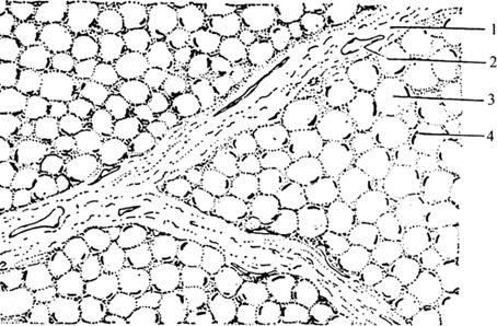 1-结缔组织 2-微血管 3-脂肪细胞 4-脂肪细胞核