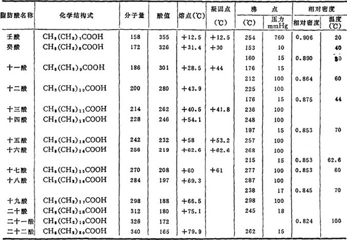 | 释义 | 脂肪酸 结构式 R-COOH R代表烃链,其链长度可从C1~C22,烃链也可分为饱和的和不饱和的两种,同时烃链的排列也可分为直链的和支链的。 性能 见脂肪酸的物理化学性质表。 肪酸的物理化学性质
