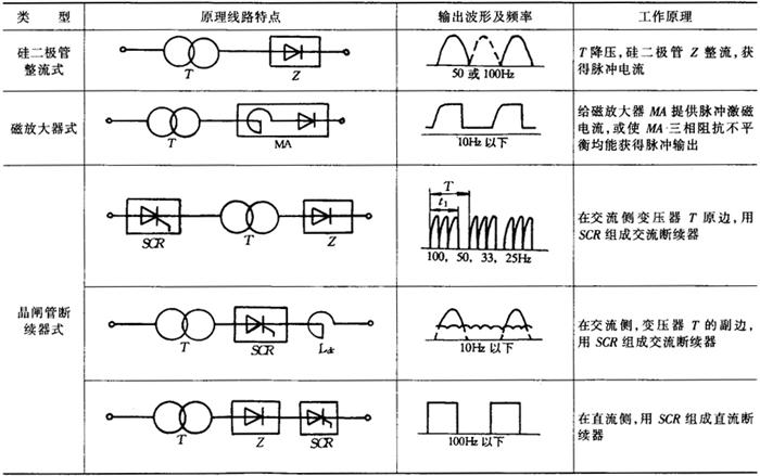 | 释义 | 脉冲弧焊电源的原理和类型 脉冲弧焊电源的电流,一般由基值电流和脉冲电流组成,这两种电流可以由二个独立的电源共同提供,也可以由一个电源提供幅值大小交替变化的电流,作为基值电流和脉冲电流。根据获得脉冲电流的原理不同,将脉冲弧焊电源分成五种基本类型,见表11-27。 表11-27 脉冲弧焊电源的基本类型