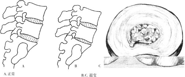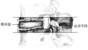 图1-36 髓核的支点作用 髓核的水分在出生时为88%,18岁时为80%,到77岁时只为69%。纤维环的水分在出生时为78%,30岁时约为70%,以后数值几乎不变,至老年开始稍见下降。髓核内的水分则随年龄增长而稳步下降。年轻人椎间盘突出后,水分丢失,胶原蛋白及粘多糖均减少。 髓核的营养经软骨板渗透,直立时椎体承受压力加大;卧位时,压力消除,肌肉张力减小,液体经软骨板渗透至髓核。血供贫乏可能是引起椎间盘早期退化的原因。 髓核的功能取决于界膜的完整,即上、下软骨终板及其周围的纤维环是否完好无损。髓核的半流体性质允许它在脊柱的活动中改变形状。 每个椎间盘及相邻椎体及骨突应视为-个运动单位,具有一定动力及机械功能。一个运动单位发生紊乱必然影响邻近运动单位。椎间盘的弹性及张力取决于软骨板的通透性和髓核的渗透性。椎间盘的吸液性如发生改变,不仅影响椎间盘的稳定性,而且可使椎间盘发生变性,椎间隙变窄,其后部椎间关节及椎间管必然受到影响(图1-37)。