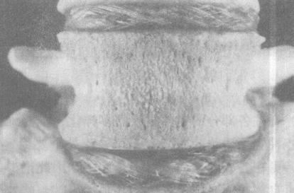 图1-29 小孩椎间盘纤维环和髓核(闪光发亮表明含水比例高) 胎儿期椎间盘内有血管出生后逐渐闭锁消失,除周围部外,无血管,其营养和代谢以渗透形式进行,所以随年龄的增长,椎间盘易发生退行性变,过度负重或剧烈运动可导致纤维环破坏,髓核突出,称椎间盘突出症,以第4~5腰椎间者多见。由于椎间盘前方有宽的前纵韧带,后方中部有窄的后纵韧带加强,后外侧薄弱并对向椎间孔,因此髓核常向后外侧突出,压迫脊神经。颈段椎间盘的后外方有椎体钩加固,胸段脊柱活动幅度小,故颈、胸段的椎间盘突出症较少见。 椎间盘的厚薄,在脊柱不同部位有所不同,在运动较多的部位如颈腰部位较厚,而在形成骨性腔隙的部位,如胸、骶部则较薄。Todd报告,L5~S1间的椎间盘可以厚达17.1mm,而胸4~5间的椎间盘仅为2.1mm。各段椎间盘和椎体的比例,颈段为27.5%,胸段为21.5%,腰段为54.4%。总体来看,椎间盘的总厚度约占整个脊柱椎骨全长的32.1%。颈椎间盘发生退变时,其高度变小,致使相应的椎间关节及钩椎关节关系发生紊乱而致骨质增生,相邻椎体后缘亦可发生骨嵴,引起神经根或脊髓受压。 腰椎椎间盘从矢状切面看,中部膨出,前后两端较大,稍内有一缩窄,全体犹如横置的花瓶,中部如瓶肚,两侧如同瓶口、瓶底及其颈部。有报道腰椎间盘厚度,前缘L1~L2为10.9mm,L2~L3为12.7mm,L3~L4为13.9mm,L4~L5为15.8mm,L5~S1为16.6mm;后缘L1~L2为6.4mm,L2~L3为7.6mm,L3~L4为8.7mm,L4~L5为9.7mm,L5~S1为8.5mm。上述测量显示椎间盘前、后缘厚度除腰前、后缘外,自上而下均逐渐增高,而前缘厚度均大于后缘。 (-)椎间盘的构造 椎间盘由软骨板、纤维环和髓核构成。纤维环由坚硬的致密胶原纤维形成,围绕髓核(图1-29)。 (1)软骨终板:软骨终板即椎体的上下软骨面做成髓核的上下界。在椎骨发生过程中,椎体的上下面各有一次级骨化中心,周围部虽成骨,形成骺环,但中心部仍一直保留为软骨。椎体上的软骨板可以防止椎骨受压,只要软骨板保持完整,椎体就不会因受压而发生骨吸收;软骨终板可视作半渗透膜,水分可以扩散至无血管的椎间盘。 (2)纤维环:纤维环与上下软骨板和脊柱前、后纵韧带紧密相连,作同心层排列。纤维环中各层纤维的方向彼此成30°~60°,相互编织。前部及外侧部较后部约宽1倍,后部层次少,相邻层的纤维接近平行,连接物质亦较少,最内层纤维与髓核的细胞间基质相融合,无明显界限(图1-27、图1-28)。 纤维环甚坚固,紧密附着于软骨板上,保持脊柱的稳定性。纤维环的特殊排列方向,使相邻椎体间可以有轻度活动,但当运动到一定限度时,纤维环紧张,又起到节制韧带的作用,管制旋转运动。纤维环主要由胶原纤维组成;也含有弹性纤维,可稍伸长。 (3)髓核:髓核是一种有弹韧性的液态胶状物质,约占椎间盘切面的50%~60%,位于椎间盘的中央,在下腰椎则偏向后方。髓核含有水分及退化的脊索残余。髓核由软骨样细胞和分散于细胞间的基质组成,并有分化较差且不太致密的胶原纤维网,含大量亲水性氨基葡萄聚糖的胶样凝胶。 髓核的形状由周围的纤维环及上下软骨板所限定,但可随外界的压力改变其位置及形状。髓核的基质和原纤维结构并无一定排列。儿童髓核的结构与纤维环明显划分;老年人由于髓核的纤维变粗,两者的区别则不明显。 (二)椎间盘的血供 胎儿及幼儿有血管分别从脊柱的前、后面中点,行向软骨椎体的中心。背内侧椎体动脉注入背侧血管湖,向上、下各分出一支,至椎间盘中心,即轴向椎间盘动脉,邻近脊索。腹内侧椎体动脉注入腹侧血管湖,与前者分布相同。 一般认为,成人椎间盘几乎完全无血管,仅纤维环周围有些小血管穿入,其营养主要靠椎体内血管通过弥散和渗透作用而获得(图1-30)。如椎体营养动脉发生变性或栓塞,必将导致椎间盘缺氧而使椎间盘变性、腰段椎体营养动脉末端卷曲,营养动脉数目愈向下愈少,第5腰椎最少,这也可能是L4~L5及L5~S1椎间盘容易发生病变的原因。