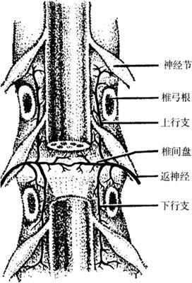 图1-30 椎体内的血管侧面观 (三)椎间盘的神经支配 分布于椎管的窦椎神经,发支至椎间盘。窦椎神经(sinu-vertebral nerve)或称脊膜支(ramus meningeus),有两个根,脊根起自脊神经或脊神经节,交感根常起自邻近脊神经节的后交通支或脊神经节。窦椎神经在脊神经干分为前后支之前发出,经椎间孔返回椎管。向上围绕椎弓根基底,行向椎管前面中线(图1-31)。在行程中,发出分支至后纵韧带、骨膜、硬膜外间隙的血管及硬膜。并发支行向相邻椎间盘,但是否进入纤维环尚存在不同意见(图1-32)。窦椎神经的上下分支相连,甚至越过中线与对侧分支相连,神经内同时含有感觉及交感成分。窦椎神经受刺激时,可引起腰部及股后肌群反射性痉挛及腰腿痛。