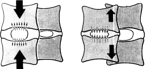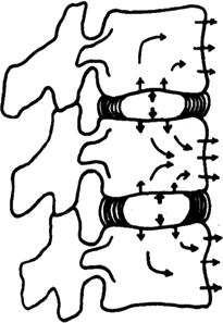 图1-32 窦椎神经(返神经)分支支配椎间盘 (四)椎间盘的功能及生理特点 椎间盘不但是椎体间主要的坚强联系与支持结构,同时也是脊柱运动和吸收震荡的主要结构,起着“弹性垫”的作用,能承受身体的重力,将施加于脊柱的力吸收并重新分布(图1-33)。椎间盘能保护和控制脊柱各种活动,有平衡缓冲外力的作用。椎间盘受到压缩或牵引后,能很快恢复原来形状(图1-34)。随体位不同,椎间盘承受的压力也发生相应的改变,一般在坐位时最大,直立位较小,卧位最小。