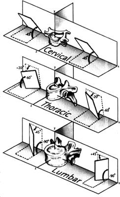 图1-38 不同椎体节段关节突关节的角度及其平面展示