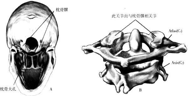 图1-40 颅骨的枕骨髁与寰椎的上关节面相关节 (二)寰枢关节(atlantoaxial joint) 寰枢椎之间有两个车轴关节及两个磨动关节,前者即齿突前、后关节,分别由寰椎前弓后面与齿突前面之间及寰椎横韧带前面与齿突后面构成;后者即两侧寰枢外侧关节。寰椎侧块的下关节面凹陷,枢椎的上关节面凸出。这种结构可使寰枢椎之间做最大旋转。寰枢外侧关节的关节囊及周围韧带松弛,允许在一定限度内有最大范围的运动(图1-41)。