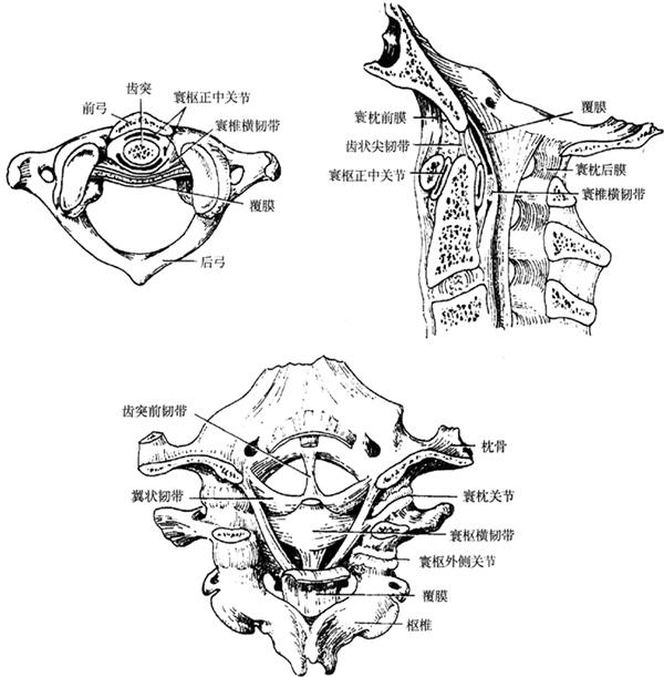 图1-41 寰枢关节 维持寰枢关节稳定的结构除关节囊,寰枢前、后膜及覆膜外,还有寰枢韧带复合体等。 关节囊连接寰椎侧块下关节面的边缘与枢椎的上关节面。寰枢前膜从寰椎前弓下缘至枢椎椎体的侧面。寰枢后膜从寰椎后弓下缘至枢椎椎弓板上缘之间,覆膜为后纵韧带向上的延续,呈扇形,附着于枢椎椎体后面,在寰椎横韧带和枢椎齿突之后。 寰枢韧带复合体的主要部分为寰椎十字韧带,分横部及直部两部分。横部即寰椎横韧带,甚为坚强,张于寰椎两侧块内侧缘及寰椎前弓后面的小结节之间,在齿突后面的浅沟内,使齿突与寰椎前弓后面的齿突凹相接。寰椎横韧带与齿突后关节面之间构成不大的关节腔,可以防止齿突向后朝脊髓方向移动。寰椎十字韧带直部即纵束,分为上、下纵束。上纵束附着于枕骨大孔前缘,位于齿突尖韧带之后,下纵束附着于枢椎椎体后面的中部,纵束加强横韧带的稳定性(图1-42)。由寰椎侧块内面发出一束纤维,斜向内下,止于枢椎椎体后外侧,称为寰枢副韧带,能限制头及寰椎在枢椎上过度旋转。