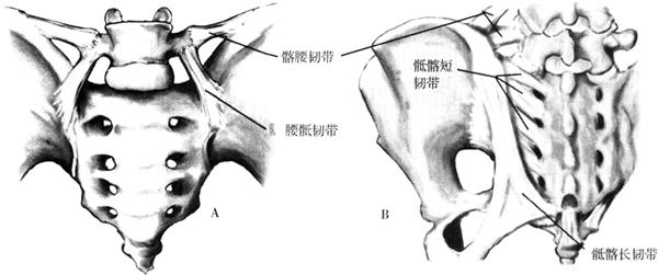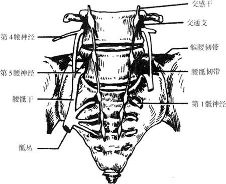 图1-44 腰骶关节 腰骶关节周围除前、后纵韧带、黄韧带、棘间韧带和棘上韧带外,尚有髂腰韧带和腰骶韧带,在位置上相当于横突间韧带。髂腰韧带伸展于L4~L5横突及髂嵴与骶骨上部前面之间。由于L4~L5横突呈放射状散开,相当于腰背筋膜的深层,前部纤维附着于髂嵴内唇的后半,偶尔形成一硬的镰刀形纤维束。髂腰韧带为宽而坚强的纤维束,是覆盖盆面腰方肌筋膜的加厚部分,其内侧与横突间韧带和骶髂后短韧带相混。髂腰韧带具有限制第5腰椎旋转,防止它在骶骨上朝前滑动的作用(图1-45)。