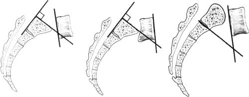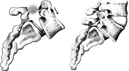 图1-46 腰骶部神经与骨骼韧带的关系 当身体直立时,在腰骶关节以及最下部数个腰椎椎弓峡部之间,剪力极大,突然用力或摔跌而发生的杠杆作用以及肌肉痉挛,都能使体重作用于这部分的剪力大为增加,腰骶角减小,可使此部分稳定性更为减低。第5腰椎峡部不连引起腰椎滑脱时,可使L5椎体向前滑移、腰椎前凸增加。腰椎椎体呈楔形变及第1骶椎顶端呈圆形变(图1-47、图1-48)。
