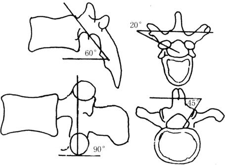 图1-58 脊柱屈曲时枢轴作用点 椎间盘内是半流体胶状的粘弹性物质,在密封下受力只有变形而不变容量。但该物质具有蠕变和滞后现象。蠕变是指椎间盘受载后,即使载荷不变,也会随受载时间的延续而持续变形。滞后是指椎间盘反复受载和去载时的能量丢失。椎间盘即借滞后作用而吸收震荡,从而防止损伤,载荷愈大,滞后作用也愈大。老年人因椎间盘变性,弹性降低,其贮存能量和分布应力的能力也逐步丧失,抗载能力因而减弱。 人跳跃时震荡力从脚传到脑,基本上被椎体和椎间盘所吸收。体重轻的年轻人滞后力大,即吸收震荡力强;体重大的和年岁大的人其椎间盘滞后力就小。震荡力反复作用于同一个椎间盘,其滞后力就会变小,也就容易发生椎间盘破裂。所以,汽车司机、摩托车司机得腰椎间盘突出症的较多。 根据Brown(1957年)测量,脊柱前屈位的轴心压力(axial load)反复1000次,可引起椎间盘破裂。这说明它的疲劳容纳度(Fatigue tolerance)是很小的。Adams MA(.J Bone Joint Surg Br 1983,65:199-203)用离体的18个人的腰椎做同样的试验,41个椎间盘中23个有纤维环突出,完全破裂者都是其后方破裂,其中一部分为椎间盘向双侧后外方突出,纤维环由内向外破裂,也有的椎间盘向正后方突出。这可说明临床上见到的双侧腰椎间盘突出症及中央型椎间盘突出症的发病原因。 腰椎间盘的压力测量方法是:用腰椎穿刺针刺入第3、第4腰椎之间,当手持20kg重物呈站立位时,椎间盘承受的压力约3倍于此人的体重;当重物减到10kg而腰向前屈曲时,其椎间盘所受压力增加到1900N,即19倍于体重。反过来讲,若人仰卧,椎间盘所受的压力比站立位的减少50%~80%。因之,对急性腰椎间盘突出症患者的要求是严格卧床休息。 椎间盘是人身上缺血的组织之一,活动度又大,特别是下颈椎段的及下腰椎段的承受应力较大,故它是人身上最早出现退行性改变的组织,尤以下颈部的及下腰椎部的病变出现率较高。肋骨有稳定和加强脊柱的作用,故胸椎间盘突出症比颈椎间盘突出症或腰椎间盘突出症少。 (三)脊柱的关节 脊椎后关节(或名小关节)是滑膜关节。在直接压力下,脊柱小关节承担的压力为33%;在脊柱旋转时,它承担45%的压力。在颈椎段,上椎体的下关节突盖着下椎体的上关节突,它与地面成45°角;胸椎关节突呈圆形,与地面成60°角;腰椎的关节突与地面几乎成90°角(图1-59)。从后面看上位颈椎的上关节突盖着相邻下位颈椎的上关节突,到胸椎中部则两邻两关节突成60°的斜面,到腰椎则相邻两关节突呈侧向对侧面了,即下关节突移到外侧面了。