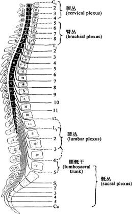 图12-14 脊神经与椎骨序列关系示意图 综上所述,脊神经系由感觉、运动及自主神经三种纤维组成。当脊神经损害时可能会产生运动麻痹、感觉障碍与自主神经营养障碍三个方面的症状。但由于脊神经主要由前根、后根组成,以及不同的神经、不同的局部关系走行,不同病因可以有不同的症状。当后根病变为完全性的,其所支配区中所有感觉都丧失;若损伤为不完全性,则仅出现相应的感觉减退,例如局限性肿瘤、带状疱疹等,病变压迫损害一个后根或一对后根时,能精确地指明疼痛的位置。若为脊神经的损害,由于其系混合性,故常表现其所分布区皮肤感觉障碍、疼痛和感觉异常,以及该神经支配的肌肉麻痹、萎缩及植物性机能障碍等。所以,对脊神经与神经丛的组成、位置、走行以及它们所分布的皮肤和支配的肌肉等有明确的了解,才可能理解所产生局部症候,对脊神经的损害方能作正确的诊断并作出及时治疗,以达到康复之目的。 |
