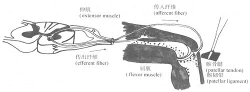 图12-105 骨骼肌牵张反射示意图 肌梭与周围的普通骨骼肌纤维平行排列呈并联关系。这些纤维又称为梭外纤维(extrafusal fiber),当其因重力作用被牵拉变长时,肌梭也变长使中间部分的感受装置受刺激增加,产生传入冲动增加,通过反射作用(reflex action)而使同一块肌肉收缩,这就是牵张反射(stretch reflex)。相反,当梭外肌收缩变短时,肌梭也变短,其中间部分的感受装置受到的刺激减弱,产生的传入冲动减少,甚至停止发放,牵张反射活动减弱或抑制,于是这块肌肉的肌纤维长度恢复。γ运动神经元支配梭内肌,当它兴奋时,可使梭内肌的收缩部分(即梭内肌两端)收缩,使中间部位的感受装置被牵拉而提高其兴奋性,从而增加肌梭的敏感性,对调节牵张反射具有重要意义。 (2)腱器官(tendon organ)对牵张反射的抑制作用:腱器官是肌肉的另一种牵张感受装置,它分布在肌腱胶原纤维之间,与梭外肌纤维呈串联关系,是感受肌张力变化的一种张力感受器(tonic receptor)。当骨骼肌受牵拉时,该肌的肌梭兴奋,通过牵张反射(stretch reflex),使被牵拉的肌纤维收缩,使腱器官张力增加而受刺激,增加由腱器官向中枢发放的这种本体感觉信息(proprioceptive information),通过抑制性中间神经元(inhibitiory interneurons)抑制牵张反射,从而可避免该肌过度收缩而受损。 (二)屈肌反射与对侧伸肌反射 当一侧肢体皮肤受到伤害性刺激(nociceptive stimulus)时,可引起该侧肢体屈肌收缩,同时该侧肢体的伸肌舒张,致使该肢体发生屈曲,称为屈肌反射(flexion reflex)。这一反射可使受刺激肢体躲开伤害性刺激,具有保护性意义。在这一反射中,如果所给予的伤害性刺激较强,则在引起同侧肢体屈反射的同时,对侧肢体可出现伸直反射活动。这一反射活动则称为交叉伸肌反射(crossed extensor reflex),其生理意义在于当出现屈肌反射时,对侧肢体的伸直,可支持身体不至于向一侧歪倒。 (三)脊休克 在整体情况下,脊髓参与的一切反射活动都是在高级中枢的调节下完成的。当脊髓被横断而脱离高级中枢的调节后,在断面以下的脊髓将暂时丧失参与反射活动的能力而进入无反应的状态,这种现象称为脊休克(spinal shock)。 脊休克的主要表现为横断面以下的脊髓参与的反射活动暂时消失、骨骼肌紧张性下降、外周血管扩张、血压下降、发汗反射消失,直肠和膀胱中分别有粪和尿潴留。 脊休克是暂时现象,经过一段时间后,脊髓又可恢复它参与的一些基本反射活动。反射恢复的速度可因动物的种类不同而有较大的差别。如蛙类这样的低等动物,在脊髓离断后数分钟内即可恢复;犬则需要数天;而人类恢复最慢,需数周至数月。反射的恢复过程中,先是屈肌反射(flexion reflex)和腱反射(tendon reflex)等原始而简单的反射,然后才是较复杂的交叉伸肌反射(crossed extensor reflex)。同时,血压也慢慢恢复并维持一定水平,排尿、排便反射也可恢复到一定程度。但以上反射的恢复并不完善,不能受意识的控制。这一现象除进一步说明脊髓可完成一些基本反射外,还说明脊髓参与的这些反射在正常情况下,必须在更高级的中枢调控下才能使反射协调完善。 |