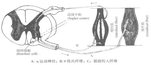 | 释义 | 脊髓对躯体运动的调节 脊髓(spinal cord)是完成躯体运动最基本的反射中枢。 脊髓灰质前角中存在着大量的运动神经元(motor neurons),它们又分为α运动神经元和γ运动神经元两种类型。α运动神经元的胞体大,纤维较粗,其末梢分成许多小分支,每一分支支配一条肌纤维。一个α神经元及其支配的所有肌纤维便组成一个功能单位,称为运动单位(motor unit)(图3-13)。运动单位有大有小,大的运动单位一般是由支配粗大运动的神经元形成,例如一个支配肢体肌肉的运动神经元所支配的肌纤维数可达2000条。小的运动单位一般是由支配精细运动的神经元形成,例如一个支配眼外肌的运动神经元所支配的肌纤维只有6~12条。γ运动神经元的胞体较小,轴突较细,其纤维支配骨骼肌的梭内肌纤维,主要调节肌梭感受传入冲动的发放。 中枢神经系统对一切躯体运动的调节,经过中枢整合的传出冲动(efferent impulses)都必须会聚于α运动神经元来调节骨骼肌的活动。因此,可以认为α运动神经元是调节骨骼肌活动的“最后公路”(final common pathway)(图12-66)。 在脊髓水平即可完成以下一些重要的躯体反射。 (一)牵张反射 骨骼肌受到外力牵拉而伸长时,可引起受牵拉的肌肉收缩。这种反射称为牵张反射(stretch reflex)。 1.牵张反射的分型 牵张反射有以下两种类型。①肌紧张(muscle tonus):由于缓慢而持续牵拉肌腱所引起的牵张反射即肌紧张。它表现为骨骼肌轻度而持续地收缩,并维持一定张力而不被拉长。通常肌紧张主要表现在伸肌方面,屈肌肌紧张并不明显。肌紧张的生理意义主要是维持躯体一定的姿势。②腱反射(tendon reflex):指快速牵拉肌腱时引起的牵张反射(stretch reflex)。在临床上用叩诊锤叩击股四头肌肌腱引起的股四头肌收缩,使小腿向前方伸直的膝跳反射,以及叩击跟腱引起的腓肠肌收缩的跟腱反射等都是典型的腱反射例子。腱反射的减弱或消失,提示反射弧(reflexarc)某个环节有损伤;而腱反射亢进,则提示参与反射的高级中枢有病变。因此,临床上常通过腱反射的检查诊断神经系统的功能。 2.牵张反射的反射弧(arc of stretch reflex) 以上两种牵张反射的反射弧基本相似。感受器是肌梭(spindle)和腱器官(tendon organ),效应器是受牵拉的肌纤维(muscle fiber),基本反射中枢为脊髓(spinal cord)。两种反射的区别在于腱反射的反射弧较简单,为单突触反射(monosynaptic reflex)。即传入神经由背根进入脊髓灰质后,直接达前角与神经元发生突触联系(图12-104)。肌紧张则为多突触反射(multisynaptic reflex),即中枢的突触联系在两个以上。