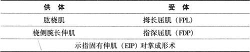 图15-2 手放松时通过屈伸腕部可显示自然的肌腱固定效应。此效应表明屈腕时会伴随伸指,伸腕时会伴随屈指。若肌腱有缺损,这种效应则会消失 骨间前神经麻痹会导致拇指屈曲及食指指深屈肌功能丧失,中指指深屈肌功能减弱。对掌及旋前功能则保持完好。可行ECRL转移以恢复食指指深屈肌功能,肱桡肌转移替代FPL以恢复拇指屈曲功能(表15-5)。 表15-5 骨间前神经(AIN)麻痹的肌腱转移治疗