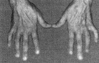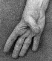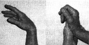 图15-4 “爪形手”:掌指间关节过伸及指间关节的屈曲