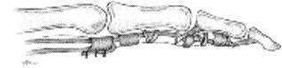 图15-7肌腱的并列联结调整(side-by-side adjustments)以保持外在平衡 转移一块肌肉也可能改善虽存在但已经削弱的功能。这种情形常见于拇长伸肌功能减弱或丧失及拇内在肌麻痹时转移肌肉以替代拇长屈肌功能的病例中,它会产生拇指指间关节过伸的效果,除非后者已事先稳定。指间关节的稳定可通过关节固定术或转移促稳定物而实现。Higgs偏好后一种方法,此种情况下,可使用劈裂的拇长屈肌转移至拇长伸肌(图15-8)。