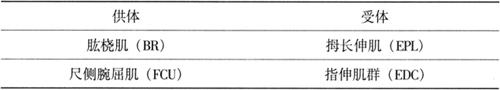 图15-6 固有食指伸肌转移至拇长伸肌 以往,人们尝试过各种各样的肌腱联合转移术。其术式的选择多取决于外科医师的经验和偏好。Higgs的习惯是偏向于旋前圆肌(PT)转移替代桡侧腕短伸肌(ECRB)行使腕伸功能,尺侧腕屈肌(FCU)转移替代指伸肌群(EDC)行使伸指功能,PL至改道的EPL以行使伸拇功能(表15-7)。若掌长肌缺如,则可用环指浅肌转移以替代行使伸拇功能。 表15-7 高位桡神经麻痹的肌腱转移