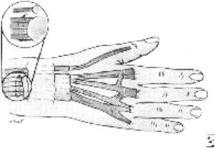 要记住,功能丧失越多,想要通过主动的转移术恢复所有的运动功能就越不可能。在难以主动重建较多功能时,正确应用腱固定术可有助于恢复肢体一些有用的功能,尽管这些功能可能不太理想。在肘水平以下只有肱桡肌起作用的病人便是一个很好的例子。此类病人最理想的情况是恢复指特别是拇指的屈曲、伸展和腕屈、腕伸等。但由于只有一块肌肉可用于转移,不可能主动恢复所有的这些功能。 一个合理的折中办法就是转移肱桡肌替代桡侧腕短伸肌以行使主动的腕伸功能。然后行拇长屈肌、指深屈肌、拇长伸肌、指伸肌群等的肌腱固定术。肌腱固定术可通过腕伸和腕屈以加强天然的肌腱固定效应。肱桡肌提供主动的腕伸功能,可产生指特别是拇指夹捏样动作。由重力引起的腕屈则可放松此动作。整个重建可分为两个步骤进行:肱桡肌转移和伸肌腱固定可为一步,屈肌腱固定则为另一步。 当尚存的有活力的肌肉更加少时,这些保持功能的肌肉被集中起来以产生肌肉的群体运动,然后是单独的每个手指的运动,往往还能正常发挥手指功能。例如,转移肱桡肌以伸食指、中指、环指及小指是最好的方案。若这些要求都不能满足,可能也没有其他更好的选择了。这种情况下,为每个手指提供最佳的运动必须平衡好外在的浅肌腱。这可通过深肌腱或浅肌腱适当的并列联结而实现(图15-7)。这些肌腱被重新定位排列和联结,使得一块肌肉可以驱动所有手指产生一致的运动。