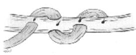 图15-10 Pulvertaft编织法 神经肌肉刺激器在设置转移张力时亦很有帮助。在完成Pulvertaft编织之前,使供肌在全移动幅度的中点时或受体关节在全功能弧的中点时将两者缝接,形成初步连接。此时最大程度地刺激供肌。可预计术后的功能。 依据刺激器刺激时所观察的结果调定最后张力(图15-11)。在应用刺激器时,肢体保持温暖和良好的血运。要避免过张力过度,因为这会降低肌肉的主动收缩功能。显然,张力过低也不利于产生理想的运动。