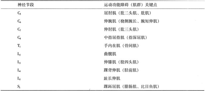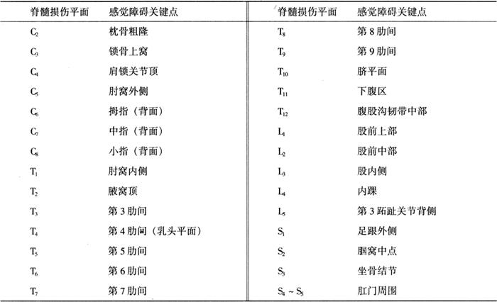 | 释义 | 脊髓损伤的评定 一、脊髓损伤的定位点 美国脊柱损伤协会(ASIA)于2000年重新修订了脊髓损伤的分类标准,在新的标准中,在人体体表分别确定10个运动点和28个感觉点,根据不同运动点和感觉点缺失的情况可大致判断判断脊髓损伤的平面。脊髓损伤运动点和感觉点的设定分别见表8-3、表8-4。 表8-3 脊髓损伤运动功能障碍关键点