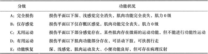 二、脊髓损伤程度判定 不完全性脊髓损伤患者的神经功能障碍的程度可因为脊髓损伤程度的不同而存在很大的差异。量化评定患者的神经功能对脊髓损伤程度的判定、术后功能的恢复、疗效的判定都具有重要的意义。其判定的方法很多,国内的以胥少汀功能评定法、上海长征医院的改良Frankel法、天津医院的瘫痪指数法为常用,国外则以Frankel神经功能分级为常用。实际上,国内新的文献也多常用Frankel法。 (一)Frankel神经功能分级 Frankel神经功能分级是国内外应用最广泛的脊髓损伤分级方法,对脊髓损伤的评定有较大的使用价值。该方法依据患者的感觉及运动功能的缺失情况,将脊髓功能分为5个等级(表8-5),其缺点主要是不包含对神经反射及括约肌功能的评定,因此还不是很完善。 表8-5 Frankel脊髓功能分级