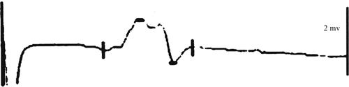 图18-8 潜时与波幅的测量法 一般认为CEP或SEP的出现决定于脊髓后索和后外侧索的完整性,反映脊髓感觉通道的功能,不能客观反映脊髓的运动功能。运动功能主要是沿皮质脊髓束、红核脊髓束和网状脊髓束传导,位于脊髓的前索和前外侧索,且与后索和后外侧索有着不同的血液供应。 (二)脊髓诱发电位(SSEP) 操作方法基本与皮层诱发电位相同。实验中通过刺激动物下肢周围神经(坐骨神经、腓总神经或胫后神经),在脊髓不同阶段,特别在腰骶段可得到明显SEP主反应,除P2外比较恒定。后反应波形随脊髓节段不同变化较大。SSEP的缺点是波幅小,干扰多。组成下肢周围神经的纤维主要集中在腰骶段,此段波幅较大,图形清晰,属于节段性SEP。而胸、颈段引出的SEP属于传导性或节上性,在胸段又受心电、脉波、呼吸运动和肌电的干扰,图形常不规律或难于引出。 在脊髓损伤的实验研究中,SEP的变化可反映出脊髓传导功能受损的程度。SEP的异常表现以N1与P1最敏感,主要为峰潜时延长,以至无波峰而不能计算,波幅降低至成一直线。一般认为,完全性脊髓损伤的CSEP呈一直线,分不出潜时与波幅值;而不完全性脊髓损伤的CSEP表现为峰潜时延长和波幅下降。但其峰潜时延长的时间与脊髓损伤程度难以确定,而波幅下降是一个可计算指标。波幅下降30%代表部分传导阻滞;波幅下降超过50%在急性脊髓损伤仍属于不完全损伤,但用之于手术中监护,则提示脊髓产生不可逆转的损伤。SEP恢复快慢与脊髓损伤轻重程度有关,脊髓损伤后6小时,SEP出现,说明脊髓可恢复,预后较佳;而24小时后SEP仍不出现,则预后不佳。 (三)运动诱发电位(MEP) MEP是指应用电或磁,刺激皮层运动区或脊髓,产生兴奋,通过下行传导径路,使脊髓前角细胞或周围神经运动纤维去极化,在相应肌肉表面记录到的电位。 技术与方法 1.刺激方法 按刺激电极放置的部位不同可分为直接刺激和间接刺激两种。直接刺激是将电极直接放置与大脑皮质运动区上或硬膜外,而间接刺激是将电极放置与大脑皮质运动区的体表面。按电极的两极相对位置不同,分为单极刺激和双极刺激,单极刺激为正负极间电流方向垂直穿过皮质运动区,而双极刺激则为双极间电流呈切线方向穿过皮质。 直接刺激电极多用针电极或银杯电极,刺激频率为0.3~3Hz,时限0.1ms,刺激强度为4~6mA,间接刺激便于临床应用。单极刺激电流较集中在一个皮质区域内,其有效刺激所需电流量较小,一般<100mA,脉冲时限<50ms,而双极刺激的刺激区域与大脑皮质呈切线方向,故需要较大电流量,一般为350~1000mA,时限为100ms。 2.记录方法 根据接收信号的部位不同,分为脊髓运动诱发电位(spinal motor evoked potential,MEP)、神经运动诱发电位(neural MEP,NMEP)和肌肉运动诱发电位(muscle MEP,MMEP)。SMEP为在脊髓收集到的电信号,常采用双极记录,阳极在尾侧,阴极在头侧,用表面电极或针状电极。NMEP一般在正中神经或坐骨神经接收,用针电极。MMEP因其简单易行,临床多用,可用表面电极或针状电极做单极或双极记录。在动物实验中做双极记录,可将针刺入被记录的肌肉,正负极相距4cm,正极在头侧,参考电极刺入脚掌。 3.脊髓损伤与MEP 实验研究认为MEP信号沿脊髓前外侧索传递,对实验性脊髓损伤较SEP敏感且与动物运动功能一致,MEP的恢复先于动物运动功能恢复。 脊髓损伤表现在MEP潜时延长,波幅降低,甚至不能引出。但需注意的是,脊髓损伤早期,脊髓休克时,脊髓前角运动神经元处于超极化状态,也不能引出MEP。因此,待脊髓休克期过后,以MEP检测脊髓损伤,结果方可靠。 脊髓不同部位损伤对MEP的影响:将动物脊髓右后1/4切断,双下肢MEP正常存在;后半切断,MEP基本正常;左半侧切断,左侧MEP消失,右侧基本正常;完全切断,则MEP消失。 (四)3种诱发电位(CSEP、SSEP、MEP)术中监测脊髓功能的实验研究 诱发电位具有以下特征:①反应形式恒定;②具有一定分布空间;③与刺激有稳定的锁时关系(time-locked effect)。多数学者认为此技术具有客观性、敏感性和重复性较好等优点,有的学者认为临床应用可以取代唤醒试验。但也有不少学者持不同看法,认为诱发电位既不敏感又不特异,临床实用价值不大。沈慧勇等应用CSEP监测脊柱手术多例,亦发现波形受许多非监测因素影响,存在一定的假阳性,几乎都要与唤醒试验结合才能最后判断神经有无损伤。 1.实验方法 沈慧勇等选用最接近人类的灵长类动物——猴进行3种诱发电位术中监测脊髓功能的实验研究。实验共选用10只健康猴,直接模拟脊柱手术,气管插管,应用几种常用的麻醉药物,最后控制性降血压,观察这些非监测因素对猴皮层体感诱发电位(CSEP)、脊髓体感诱发电位(SSEP)和运动诱发电位(MEP)的影响,评价几种诱发电位技术在术中监测脊髓功能的实际应用价值。 诱发电位监测使用美国Nicolet公司生产的Viking诱发电位仪。皮层记录电极放在头顶皮下,硬膜外记录电极置于T12水平(背部小切口,暴露椎板,咬除黄韧带后放电极)。运动记录电极置于两侧胫前肌,参考电极置于踝前肌腱中。体感诱发刺激电极放在双踝内后方,刺激胫后神经。运动诱发采用颅外磁刺激器,置于皮层运动区,记录对侧MEP。SEP和MEP信号输入Viking系统的前置放大器进行放大、平均。 刺激类型为方波脉冲,波宽0.3ms,频率4.7Hz,强度为4.1~12.6mA,以引起脚趾抽动为标准。放大器灵敏度5μV,分析时间50ms。 麻醉及观察方法:氯胺酮诱导麻醉