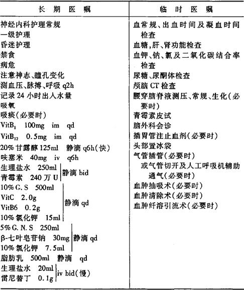 说明:(1)急性期病人要绝对卧床休息,对躁动不安者可适当予以镇静剂,但禁用吗啡、哌替啶等呼吸抑制药物。重症病人病情稳定后(一般为起病后3天)可改鼻饲流汁。 (2)脱水治疗在脑出血的治疗中至关重要。甘露醇目前主张用小剂量多次给药的方法,必要时合用呋喃苯胺酸40mg,静滴,每6小时1次。这样可以在达到理想的脱水效果的同时最大限度地减轻了甘露醇对心、肾的损害,但要注意水电解质平衡,如无禁忌证时,部分重症患者可短期使用激素,目前激素已有被β-七叶皂苷钠取代的趋势。脱水治疗的时间视脑水肿情况而定,一般5日左右开始逐渐减量。亦可静滴10%甘油盐水250ml(每12小时1次)代替。 (3)脑出血病人血压调控要慎重,当血压在200/120mmHg以下时不宜降压(部分因血压升高引起自觉症状的患者除外),当血压在200/120mmHg以上时,可先用脱水剂,如降颅压后血压过高,则需加用降压药物。如硫酸镁、卡托普利、尼群地平等。以降到稍高于平时血压水平为宜,切忌降压太快、太剧。 (4)神经元保护治疗在脑出血的治疗中日益受到重视,主要有抗氧自由基、抗钙超载和抗兴奋性氨基酸三大方面的治疗,目前自由基清除剂在脑出血治疗中使用较普遍,常用药物有甘露醇、Vit C、Vit E、地塞米松、苯巴比妥等药。 (5)是手术治疗还是非手术治疗更能提高脑出血患者的生存质量,目前仍无定论,通常认为,在占位效应不明显和神经系统功能始终稳定的情况下,适宜非手术治疗;当因出血和/或水肿引起占位效应加重,从而导致神经系统功能恶化时,需采用手术治疗。 (6)不常规使用止血药,只有合并消化道出血或疑有出血性疾病时才用。 (7)重症患者应尽量避免腰穿,必要时要谨慎进行,以免诱发脑疝。 (8)发病后2天的输液量应控制在2000ml/d以内,不包括甘露醇用量。 (9)合并消化道应激性溃疡出血时,参照消化道出血处理。 (10)有中枢性高热(表现为体温骤升至39℃以上,体表无汗且双侧程度不对称,相对缓脉,白细胞正常),可用物理降温及一般解热药和类固醇药物,无效时可试用亚冬眠疗法。 (11)并发中枢性肺水肿者除治疗原发病外,可用山莨菪碱20~30mg或东莨菪碱0.6mg加入500ml液体中静脉滴入。 (12)康复期治疗包括针灸、高压氧和生物反馈治疗等。 |