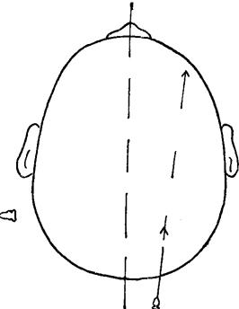 图143 侧脑室后角穿刺方向 2.用脑针向眉间方向穿刺,一般距头皮约7~8厘米处进入脑室,有脑室扩大者,约3~5厘米可达脑室(如未能进入脑室,可改变方向重新穿刺),或作对侧脑室穿刺。 3.测量脑室初压后,先缓慢放出脑脊液5~10毫升,继而注入等量气体,进行气液交换,一般交换至无脑脊液流出,轻度脑室扩大者,约需注气40~50毫升,脑室明显扩大者,约需100~200毫升。 (二)额部前角穿刺:该部脑皮层血管较多,易出血,可因肿瘤压迫而移位,故穿刺易失败,如需作脑室持续引流时,此法较为方便。 于发际内,冠状缝前2.5厘米,中线旁开2.5厘米处,作3厘米长的切口,穿刺方向与矢状平面平行,向同侧外耳道方向刺入约4~6厘米,即可进入脑室,而后充气造影(图144)。