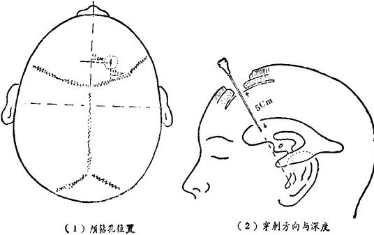 图142 侧脑室后角穿刺方向与深度