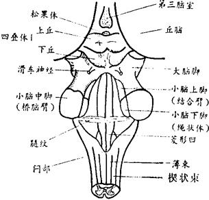 | 释义 | 脑干 脑干由延髓、桥脑和中脑组成。中脑上端接间脑,延髓下端在枕大孔处与脊髓相连。脑干是脑部所有重要传导束的共同通道,又是多数颅神经核(除嗅、视神经外)所在。 (一)脑干外形: 脑干腹侧面:其中部为大量横行纤维隆起,是桥脑的基底部,其上方为中脑,下方为延髓。中脑两侧的纵行隆起为大脑脚,是大脑半球下行运动束。此束在延髓中线两侧形成两个隆起,叫锥体,其双侧纤维大部交叉,形成锥体交叉。 脑干背侧面:在中脑有四个圆形隆起,叫四叠体,上方两个叫上丘,与视路有关;下方两个叫下丘,与听觉路径有关。四叠体首端为松果体,四叠体侧面各有称上丘臂与下丘臂的结构。桥脑与延髓背面共同构成菱形窝,为第四脑室底部,桥脑的横行纤维在两侧聚成索状,称桥脑臂,或称小脑中脚(图14、15、16)。