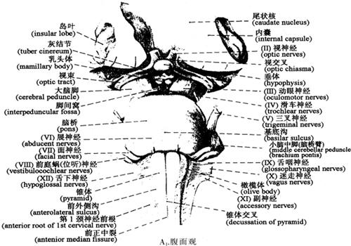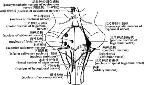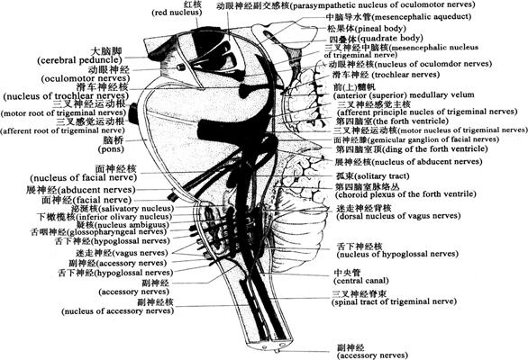 | 释义 | 脑干 脑干(brain stem)(图12-25,图12-26A、B)自下向上由延髓、脑桥和中脑组成,它似脑的柄,上连间脑,下续脊髓,背侧借脑桥臂、结合臂和绳状体接小脑。它是大脑与脊髓间联系必经之桥梁,是各种上、下行传导束,如锥体束(pyramidal tract)脊髓丘脑束(spinothalamic tract)等必经之路,也是网状结构(reticular formation)主要的解剖部位。在脑干内尚有与生命活动息息相关的生命中枢,如心血管中枢(cardiovascular center)、呼吸中枢(respiratory center)等所在地,因此机能上十分重要。 另外,后10对脑神经及相应的脑神经核都位于脑干内,所以脑干病变的主要特点是表现为相关脑神经及神经核的机能障碍。