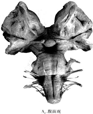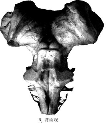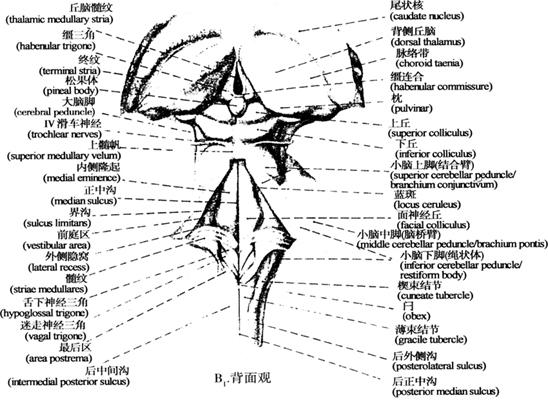 图12-26 脑干的外形(B2) (一)脑干的外形 脑干的腹面借表面的桥延沟和脑桥上缘为界,从下往上依次分为延髓、脑桥和中脑(图12-26A)。延髓部中线的两侧各有一隆起,称为锥体(pyramid),其深面有锥体束,下方为锥体交叉(decussation of pyramid);锥体外侧有橄榄体(olive),以及位于橄榄体背侧的Ⅸ、X、Ⅺ对脑神经,腹侧的Ⅶ对脑神经;桥延沟由内往外有Ⅵ、Ⅶ、Ⅷ对脑神经。脑桥腹面的正中有上下走行的基底动脉沟(basilar sulcus),有同名动脉通过,其外侧可见V对脑神经,该神经是脑桥基底部与脑桥臂表面之界标。在中脑可见由大量下行传导束所形成的粗大隆起称大脑脚,和两侧大脑脚之间形成的脚间窝,内有Ⅲ对脑神经走出。 在脑干背侧面,各部分界线不如腹面明显(图12-26B)。在延髓与脑桥背面可见菱形窝(rhomboid fossa)和中脑背侧的上丘(superior colliculus)、下丘(inferiorcolliculus),以及位于下丘下方的唯一由脑干背侧出脑的Ⅳ对脑神经(trochlear nerve),菱形窝的髓纹可作为延髓与脑桥在背侧的分界线。 菱形窝的第四脑室底,其表面有如图12-26B所示的隆起(如内侧隆起(medial eminence))、丘(如面神经丘(facial colliculus))或三角(如迷走神经三角(vagal trigrne)),其深面有(图12-27、图12-28)所示脑神经核。为便于记忆将菱形窝脑神经核分布概况于图12-29、表12-2,并将其系统化。