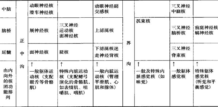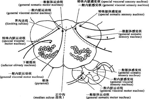 图12-29 延髓橄榄中部横切示:菱形窝深部,界沟内侧与外侧脑神经核分布示意图 表12-2 菱形窝一侧脑神经核分布