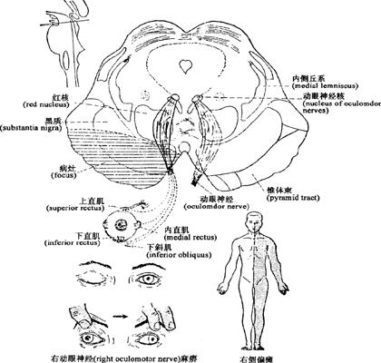 正中沟分菱形窝为左右两半,髓纹(striac medullares)将其分上下两半,界沟(sucus limitans)再把一侧的菱形窝分成内侧和外侧两份。界沟内侧份髓纹上方为内侧隆起(medial eminence)和面丘(facial colliculus),后者深面有展神经核(abducens nucleus)。髓纹下方有舌下神经三角(hypoglossal triangic)和迷走神经三角(vagal triangle),二者的深面分别藏有舌下神经核(hypogolossal nucleus)和迷走背核(dorsal nucleus of vagus nerve)。界沟外侧,均为前庭区,内有前庭神经核和外侧的蜗神经核(cochlear nucleus)。 按图12-29及表12-2,菱形窝(rhomboid fossa)内脑神经核排列的规律性如下: (1)已知脊髓内灰质核团的排列自前向后是:腹(前)(运动性)、背(后)(感觉性)。位置关系恒定,规律性明显。 (2)脑神经的功能比脊神经复杂,主要是由于头部出现接受光线、声音等高度分化的感受器,如视、听、嗅、味觉等器官;再加上到了延髓由于锥体的出现,以及中央管逐渐移向背侧,至延髓敞开为菱形窝(第四脑室),导致脑干神经核团的排列由脊髓自前向后的位置关系改变为内、外的关系,脑神经核在“界沟”(1imitingsulcus)内侧与外侧依然是有序可循(图12-29)。脑神经核排列是:界沟内侧为运动核,由正中沟向外的顺序为躯体运动、内脏运动;界沟外侧为感觉核,由内向外的顺序是特殊内脏感觉(味觉)、内脏感觉、躯体感觉及躯体特殊感觉(平衡觉和听觉)。依然是规律性清晰。 (二)脑干病变定位诊断的解剖学基础 从脑干的形态结构和脑神经及脑神经核在脑干的局部位置,下列四点对脑干病变的诊断、定位有实用意义。 (1)由于Ⅲ~Ⅻ对脑神经及脑神经核均在脑干,脑干范围小,尤其在延髓,脑神经及其核彼此相当接近,故脑干损伤时,至少有一条或一条以上的脑神经或其核被波及,如展神经核与面神经膝(genu of facial nerve)等。由于管理骨骼肌随意运动的锥体束在锥体下方交叉,传导痛、温觉的脊髓丘脑束在脊髓已交叉上行,所以一侧脑干损害时所产生的偏瘫或偏身痛、温觉障碍都在对侧,而脑神经的损害却在同侧,这种现象临床上称之为交叉性瘫(crossed paralysis)或交叉性感觉障碍(contralatral sensor disturbace),是诊断脑干病变的重要依据之一。如Weber综合征或大脑脚底综合征主要表现为锥体束与动眼神经损害,产生同侧动眼神经麻痹(眼睑下垂、眼球外科、瞳孔扩大和对光反射消失等)及对侧偏瘫(图12-30)。