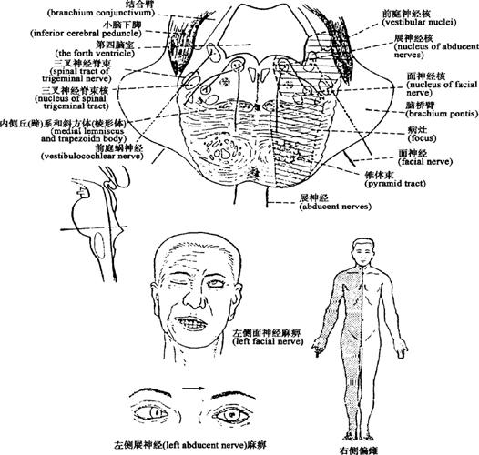 图12-30 大脑脚底综合征示意图 (2)脑神经与脑神经核在脑干内排列有一定的规律。可依据受侵害的脑神经或脑神经核提示病变在脑干中的位置。V、Ⅵ、Ⅶ、Ⅷ对脑神经麻痹,提示病变在脑桥,例如脑桥外侧部综合征(Millard Gubler综合征),由于损害展神经和面神经或其核,产生同侧展神经和面神经麻痹,表现为同侧眼球不能外转,同侧额纹消失,眼睑不能闭合,鼻唇沟变浅,口角歪向对侧和对侧肢体偏瘫等(图12-31)。