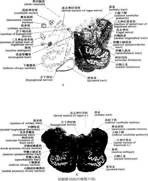 图12-32 延髓经下橄榄中部横切面(A、B)