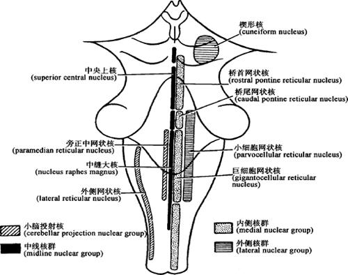 图12-31 桥脑外侧部综合征示意图 (3)脑干的三个部分以延髓体积最小,所以较小的病变,尤其在延髓背侧的病变,容易造成较显着的功能障碍,且常为双侧性。如舌下神经核小量出血或软化就可引起全身麻痹;由于非常靠近锥体束,同时也可引致两侧锥体束病变,出现四肢瘫。如病变在脑干高位、脑桥或中脑,则两侧核性损害情况较延髓少见。 (4)从脑干的结构与功能方面可鉴别病变在脑干内或脑干外,这对治疗和估计预后都有积极的意义。脑干内的病变交叉性体征明显,而脑干外的病变交叉体征不明显或有时不存在。如桥脑小脑角肿瘤,多为听神经瘤,病变早期多从出现同侧耳鸣、耳聋、眩晕等症状开始,逐渐出现同侧面神经麻痹,要到晚期才出现脑干损伤;脑干内的病变发生脑神经麻痹的时间与肢体瘫痪发生的时间相差不多,若病变在脑干外,则脑神经麻痹发生时间早得多,对侧如果有偏瘫也往往较晚,程度也较轻。 (三)网状结构 网状结构(reticular formation) 是脑干内部重要结构之一,它是比较古老的结构,保持着多突触联系的形态学特点。有人估计一个网状结构神经元可接受4000个以上其他神经元的传入,它发出的轴突可影响25000个其他神经元。所在网状结构内,大多数的轴突侧支和大多数树突分支均沿脑干纵轴垂直分布,范围广泛。它接受来自各种感觉传导系的传入,传出纤维也直接或间接联系中枢神经系的各级水平,参与机体多方面的重要机能,如睡眠与觉醒、调节肌张力、调节内脏和呼吸中枢与心血管活动中枢等。 网状结构的主要结构特点是神经纤维纵横穿行、互相交织成网状,各种大小不等的神经细胞分散在其间,这种灰、白质交织的区域称之为网状结构。所以脑干内除了边界清晰的脑神经核和薄束核、楔束核、红核、黑质等中继核团以及锥体束、内侧丘系等传导束外,还有广泛存在于脑干内的网状结构。网状结构自脊髓上胸段起始直至间脑,其中脑干的网状结构最为发达。因此,一般所述及的网状结构,主要是指脑干网状结构而言(图12-32、图12-33)。有关网状的结构、纤维联系和功能见本章第8、9节神经系统对躯体运动的调节等。