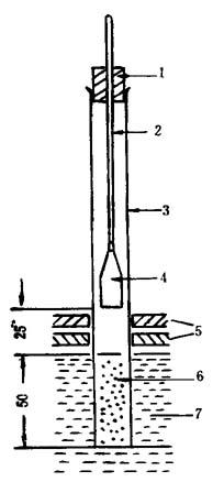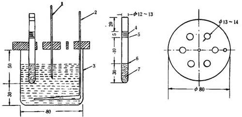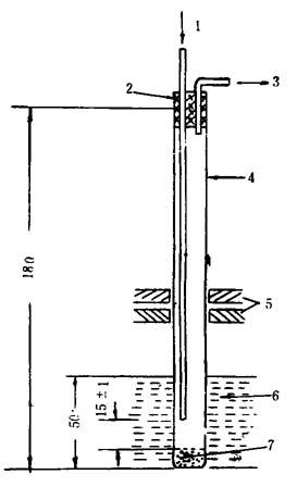 图10-7-2 ISOR182pH法反应管 1-气口体管 2-塞子 3-气体出口管 4-试管 5-隔热板 6-油浴 7-试样