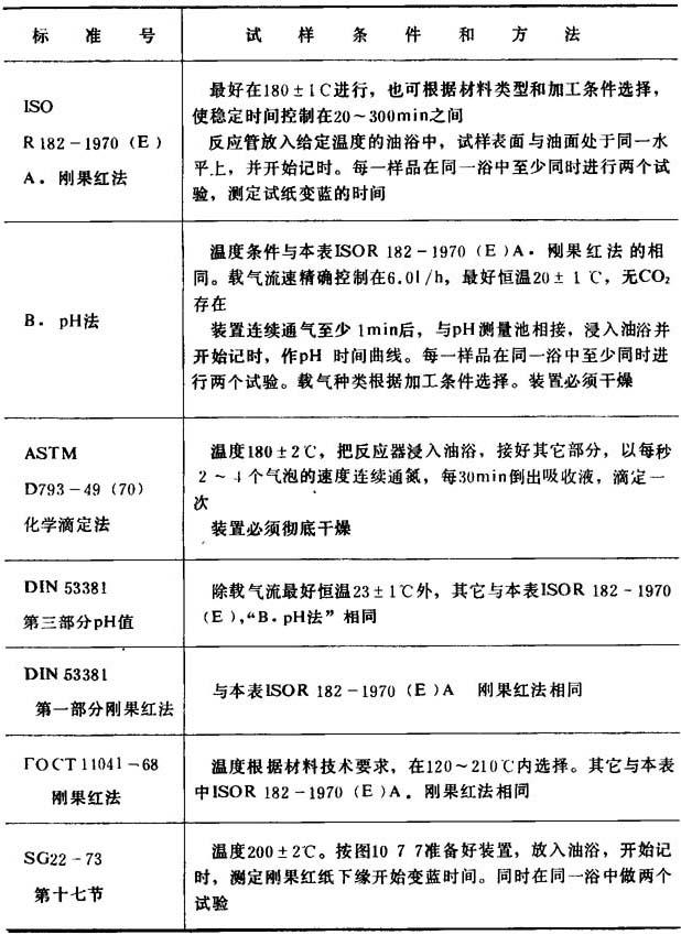 | 释义 | 脱氯化氢法 本方法是在规定温度的静态或动态气氛中,测定试样开始放出氯化氢所需的时间,或测定单位重量的试样在规定时间内放出氯化氢的量来评定其热稳定性。 (一)有关的标准 ISOR182-1970(E)用脱氯化氢法测定聚氯乙烯和有关共聚物及其混合料的热稳定性。 ASTMD793-49(70)含氯塑料短期热稳定性测试的标准方法。 DIN53381第一部分,氯乙烯聚合物和共聚物及其混合料热稳定性的测试。 TOCT14041-68用刚果红法测定聚氯乙烯和有关共聚物及其混合料的热稳定性。 SG22-73电缆工业用软聚氯乙烯的热稳定性测定。 (二)试验装置