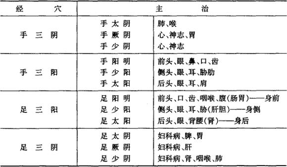 | 释义 | 腧穴主治规律 腧穴主治既有近部作用,还有远部作用,以至整体作用。特定穴则各有其特定的主治范围。 1.近部主治作用 腧穴的近部主治作用可以根据腧穴的所在部位来掌握其要领。如分布在眼区的穴位可以治疗眼病;分布颈项部腧穴,可以治疗颈、项、咽喉等局部病变;分布足部的穴位治疗足部病症等。分布在躯干部的穴位,能治疗其相应部位内脏的病症。从大范围说,胸部属于上焦,主肺、心(呼吸、循环)方面病症;上腹部属于中焦,主肝、胆、脾、胃(消化)方面病症;下腹部属于下焦,主肾、肠、膀胱(生殖、泌尿)方面病症。 2.远部主治作用 具远部主治作用的腧穴,主要指分布在四肢部肘膝以下的腧穴。手三阴经都联系胸部,可主治胸部脏腑病症;手三阳经都联系头身部,可主治头和五官病症;足三阳经都联系头身部,主治头身的前、侧、后部病症;足三阴经都联系腹部,主治腹部脏腑病症。见表3-12。 表3-12 四肢部经穴分经主治表